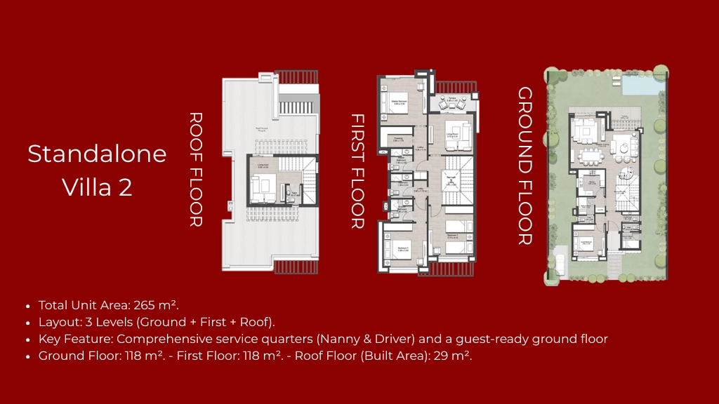 - Standalone Villa 1: 3 Bedrooms + Penthouse.